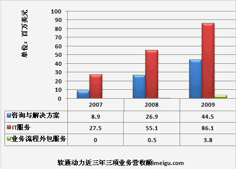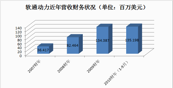 軟通動(dòng)力的收入從2007年的3642萬美元大幅增長到2009年的34億美元,年復(fù)合增長率為92.15%。2010財(cái)年前九個(gè)月,軟通動(dòng)力的收入達(dá)到1.35億美元,超過了2009年全年的收入。