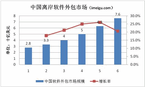 中國IT服務(wù)企業(yè)承擔(dān)的離岸IT服務(wù)項(xiàng)目主要是軟件外包。這些業(yè)務(wù)包括應(yīng)用程序開發(fā)和管理、產(chǎn)品開發(fā)、包裝解決方案服務(wù)、全球化和本地化服務(wù)等。這些客戶包括外國公司和外國公司在中國的分支機(jī)構(gòu)/子公司。中國的離岸軟件外包市場近年來也發(fā)展迅速。根據(jù)IDC 2010年7月的報(bào)告,中國離岸軟件市場規(guī)模將從2009年的28億美元增長到2014年的76億美元,年復(fù)合增長率為22.4%。