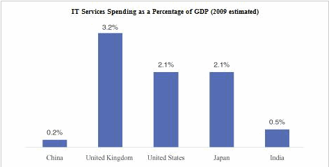 根據(jù)IMF調(diào)查公布的數(shù)據(jù),中國2009年實(shí)際GDP增長率為8.5%,2010年將增長9%,是世界上增長最快的國家。然而,中國在 IT 服務(wù)上的支出仍然相對較低。根據(jù)調(diào)查數(shù)據(jù)和國際貨幣基金組織公布的數(shù)據(jù),2009年中國IT服務(wù)支出GDP僅為0.2%,而英國為3.2%,美國為< @2.1% 在同一時(shí)期。, 2.1% 代表日本,0.5% 代表印度。也可以看出,中國IT服務(wù)市場還有很大的增長空間。