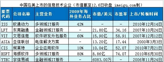 目前,軟通動(dòng)力等多家中國信息技術(shù)公司已在美國上市。以下是各大公司的主營業(yè)務(wù)、上市時(shí)間及市值、市盈率等。