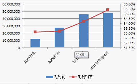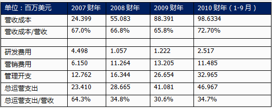 2007年以來,軟通動(dòng)力的毛利潤逐年增長,從2007年的1029萬美元增加到2009年的4600萬美元;2010年前三季度利潤達(dá)到4786萬美元;其毛利率也從2007年的28.2%提高到2009年的34.2%。