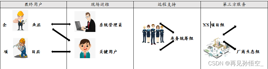 項目組由公司領導領導成立項目領導小組,領導小組下設項目組。項目團隊分為業務規劃團隊、信息中心團隊和供應商生態系統團隊。每個團隊都由業務專家和服務提供商組成。 ,各二級單位和各下屬子公司成立自己的運維團隊。運維團隊分為業務支持團隊和信息支持團隊,分別負責業務支持和權限支持