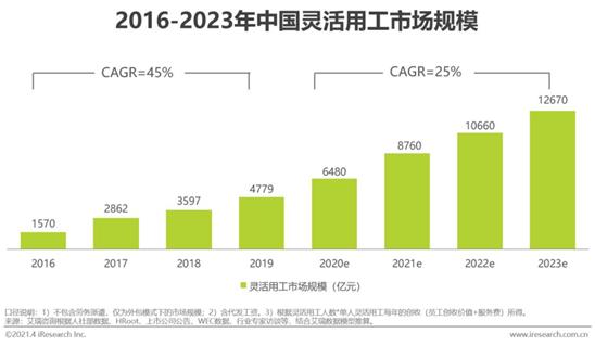 艾瑞《2021年中國靈活就業(yè)市場發(fā)展研究報告》:如果未來復(fù)合年增長率保持在25%,2022年靈活就業(yè)市場規(guī)模將突破1萬億元。
